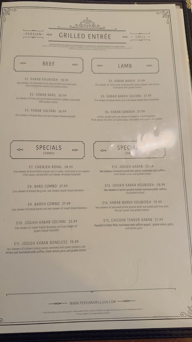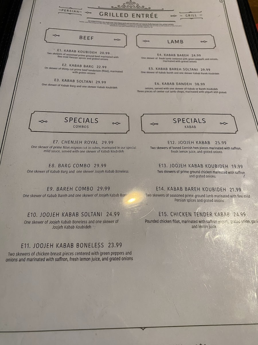 2 skewer. Specially seasoned ground prime beef marinated with fine mild Persian spices, wrapped around a skewer, open-flame charcoal grilled.